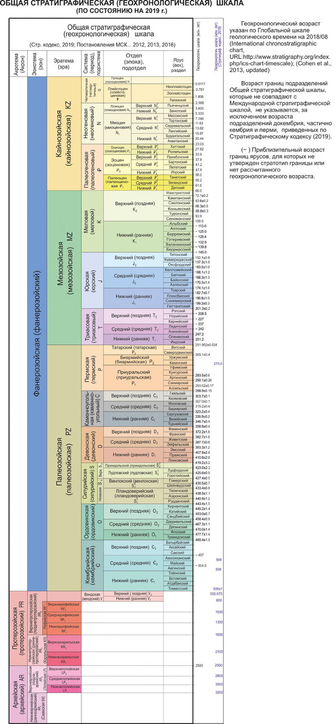 Что такое геохронологическая шкала (стратиграфическая таблица)?Начнём с краткого определения. Геохронологическая шкала — это наглядная система датирования, связывающая геологические слои со временем их образования. Она используется учёными для указания событий в истории Земли и связей между ними. Состоит из структурных единиц разной иерархии, границы между которыми определяются масштабными изменениями. Варианты изображения могут быть разными: от удобной компактной таблицы до высокохудожественных образчиков. Они будут приведены далее.Геохронологическая таблица с эрами, периодами, эпохами и ярусамиПостроена на основе последней международной шкалы (2017 год).
