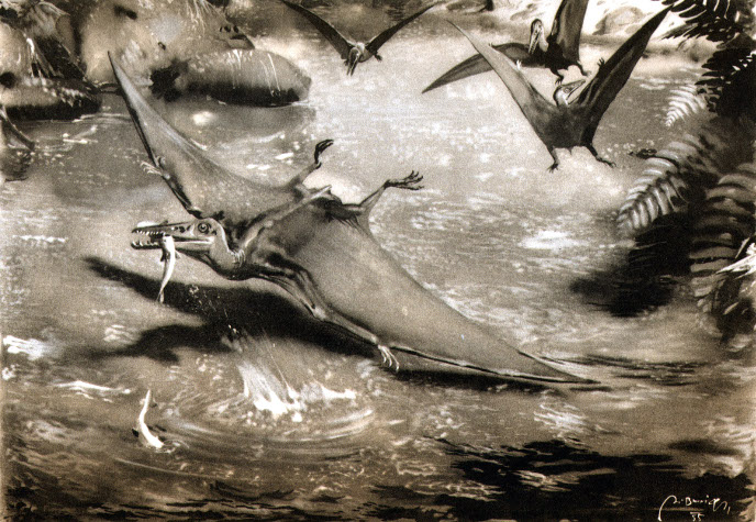 Время и место существованияСуществовали птеродактили в конце юрского периода, около 150,8 – 148,5 миллионов лет назад (первая половина титонского яруса). Были распространены на территории современной Германии.![]() Американский палеохудожник Нобу Тамура так видит птеродактиля, взмывающего над пучиной. Виды и история обнаруженияНыне общепризнан единственный вид – Pterodactylus antiquus, соответственно являющийся типовым.Это был первый летающий ящер, которому присвоили имя и дали научное описание. Поверхностное описание птеродактиля произвёл итальянский учёный Косимо Алессандро Коллини ещё в 1784 году на базе ископаемого скелета, обнаруженного в карьере зольнхофенского известняка близ города Айхштета (земля Бавария, Германия) приблизительно в 1780 г. Любопытно, что он представил птеродактиля не как летающее, а как водоплавающее животное. При этом автор практически не опирался на анатомические подробности создания, а лишь пользовался субъективным представлением о биосфере: по его мнению самые таинственные существа обитали в пучинах океана. Птеродактиль вполне проходил по критерию загадочности. Это не удивительно, ведь тогда классическая наука находилась на стадии зарождения, и к ней примешивалась масса средневековых традиций. Как ни странно, это мнение было распространено среди некоторых учёных вплоть до 1830 года. Ключевым же моментом истории является описание знаменитого французского палеонтолога Жоржа Кювье, где наконец сформировалась общая идея полёта птеродактилей. В работе 1809 года он дал роду имя Petro-Dactyle. Но в нём была допущена простая опечатка, и Кювье позднее исправил его на Ptero-Dactyle. Голотипом оного явился экземпляр BSP No. AS.I.739. В 1812 немецкий палеонтолог и анатом Самуэль Томас Зёммеринг даёт описание того же экземпляра, но уже в соответствии с научной терминологией называет вид Ornithocephalus antiquus. Однако Кювье обладает правом первенства при именовании рода, поэтому ныне вид называется Pterodactylus antiquus. В начале статьи мы объяснили название птеродактиля, имя же вида antiquus переводится с латыни как "древний". Действительно, на момент открытия это существо прорубило одно из стартовых "порталов" в мир мезозоя. ![]() На классической иллюстрации Зденека Буриана мы можем видеть активную стаю птеродактилей, ловящих рыбёшку близ берега. На текущий момент известно более 27 окаменелых образцов птеродактиля, причём многие почти полные. Однако важно отметить, что в основном это юные особи. Последний факт послужил причиной для массы не совсем точных реконструкций двух прошлых веков. Лишь недавно открытые экземпляры с хорошо сохранившимися мягкими тканями позволили наконец полностью восстановить образ птеродактиля. Строение телаРазмах крыльев птеродактиля достигал 1,04 метров. Длина тела около 50 сантиметров. Высота же до 25 см. Весил он до 2 килограммов.![]() Взрослая (зелёный) и полувзрослая (синий) особь в сравнении с человеком. Как видно по скелетам птеродактилей, передние конечности были значительно длиннее задних, причём половину каждой составлял разросшийся четвёртый палец. Дело в том, что он являл собой лёгкий, но прочный каркас для перепонки крыла. Последняя состояла из тонких мышц, покрытых кожей. Изнутри они были укреплены волокнами коллагена, а с внешней стороны поддерживались кератиновой оболочкой. В целом тонкие, но прочные мембраны широких кр