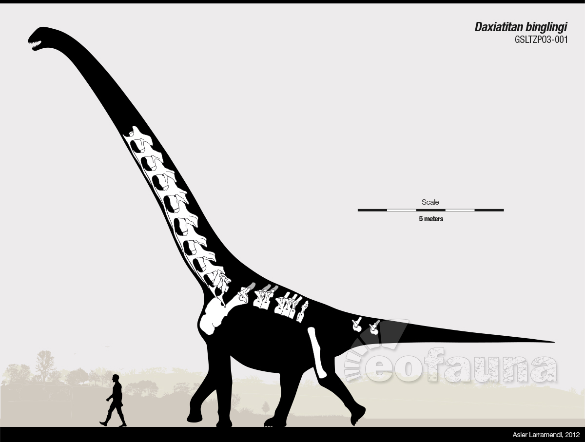Пока определены пять позиций, но постепенно будем увеличивать их число. При этом рейтинг будет периодически обновляться. Как видим, первое место сейчас принадлежит раннемеловому завропосейдону. Это не только самый высокий динозавр в мире, но и самое высокое животное из известных науке вообще. Его рост приблизительно соответствует высоте пяти-шестиэтажного дома. Жираф, самое высокое животное наших дней, по сравнению с завропосейдоном показался бы лилипутом: рекордная высота африканского млекопитающего всего около 6 м, то есть меньше почти в три раза. Предлагаем посмотреть на титана со стороны (щёлкните для увеличения). ![]() Иллюстрация из работы американских палеонтологов Мэтью Веделя и Ричарда Сифели ("Sauroposeidon: Oklahoma's Native Giant", 2005 г). Небольшое дополнение выполнено нами. Здесь: A - завропосейдон, B - жираффатитан; C - человек; D - шестиэтажное здание. Далее фотография одного из фрагментов завропосейдона. ![]() Восьмой шейный позвонок плюс задняя часть седьмого. Рядом расположились Майкл Тейлор (слева) и Мэтью Ведель (справа). Чем можно охарактеризовать лидирующую группу динозавров? Как и в случае с длиной и высотой, все лидирующие позиции занимают зауроподы – длинношеие четвероногие колоссы, питающиеся растительной пищей. При этом особенно выделяется семейство брахиозаврид и их близкие родственники. Вплотную следуют титанозавриды. Важно заметить, что такая высота достигалась в первую очередь благодаря длинной шее. С её помощью зауроподы могли не только дотягиваться до ветвей, но и объедать растительность в значительном радиусе вокруг себя. Не делая при этом лишних шагов. Будет справедливо проиллюстрировать и других лидеров. ![]() Несколько гигантских зауроподов для сравнения помещено американским палеохудожником Скоттом Хартманом на одну платформу. Не правда ли, рост динозавров весьма впечатляет? Виды указаны справа. ![]() Следующим идёт огромный китайский дасятитан, расположившийся рядом с человеком. От испанского палеохудожника Асьера Ларраменди. Рекомендуем также почитатьАвтор статьи: ArgusEye