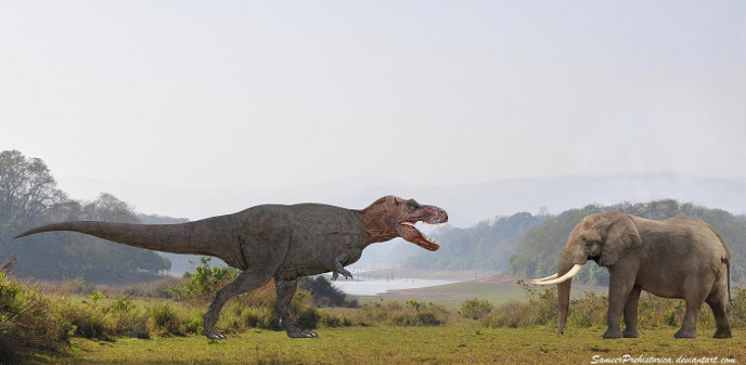 Ниже номер 2 рейтинга, тираннозавр, в сравнении с крупнейшим современным наземным млекопитающим, африканским слоном.