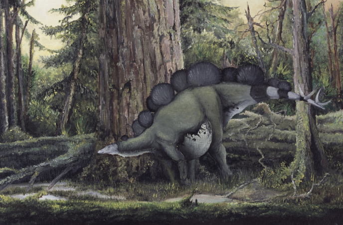 Время и место существованияСуществовали гесперозавры в конце юрского периода мезозойской эры, около 152,1 – 157,3 миллионов лет назад (киммериджский ярус). Они были найдены в нижних слоях формации Моррисон, поэтому могут считаться самыми древним стегозаврами оной. Были распространены в западной части Соединённых Штатов Америки, в штате Вайоминг.![]() Качественная художественная реконструкция гесперозавра, предложенная Андреем Атучиным. Виды и история обнаруженияНыне известен единственный вид – Hesperosaurus mjosi, соответственно являющийся типовым.Первые останки гесперозавра были обнаружены Патриком Макшерри в 1985 году в карьере Буйвола, расположенного в стратиграфической зоне №1 формации Моррисон (округ Джонсон, штат Вайоминг, США). В 2001 году его описали американские палеонтологи Кеннет Карпентер, Клиффорд Майлс и Карен Кловард. Голотип, состоящий из хорошо сохранившегося скелета без конечностей, получил ярлык HMNH 001. В начале статьи мы объяснили родовое название гесперозавра. Видовое же имя mjosi дано в честь Рональда Мьёса, собравшего и подготовившего к описанию образцы. В 2007 году в карьере Дана (та же часть формации Моррисон) недалеко друг от друга были обнаружены взрослые гесперозавр и аллозавр, получившие клички Фантазия и Дракула соответственно. Это подкрепляет популярный тезис о том, что аллозавры регулярно охотились на стегозавридов. Строение телаДлина тела гесперозавра достигала 6,5 метров.[1] Высота же до 2,5 метров. Весил он до 3,5 тонн.[1]![]() Передвигался растительноядный динозавр на четырёх толстых ногах. Тяжёлая комплекция не позволяла ему развивать высокие скорости. Небольшая голова на фоне родственного стегозавра отличается высотой и шириной в основании. Задняя часть черепа покатая. Нижняя челюсть довольно высокая, в том числе зубная кость. Надглазничные кости гесперозавра образуют ярко выраженные дуги. Как у всех стегозавров, конец головы превращается в подобие миниатюрного клюва для ощипывания растительности. Зубы были очень мелкими. Вдоль всей спины проходило два ряда костных пластин, выделяющихся своей шириной (в том числе основания) и овальностью. Туловище гесперозавра характеризуется массивностью и округлостью. Оно заканчивалось сильным хвостом, в обычном положении высоко поднятым над землёй. ![]() Насыщенная картина палеохудожника Александра Жилина о гесперозавре, забредшим в лесную чащу. Хвост доисторического ящера заканчивался четырьмя костными шипами, являвшихся традиционным оборонительным орудием. В целом гесперозавр представлял собой стегозаврида средних размеров, буквально полнящегося округлыми формами – от головы и живота до пластин на спине. На основании некоторых деталей встречаются предположения, что гесперозавр скорее стоит ближе к дацентруру, чем к стегозавру. Мы же считаем, и комплексный анализ это показывает, что он является ближайшим родственником стегозавра. Стегозавр или нет: текущий вердиктВ 2008 выходит работа Сюзанны Мэйдмент и коллег под названием "Systematics and phylogeny of Stegosauria (Dinosauria: Ornithischia)", в которой гесперозавр выделяется как вид обыкновенного стегозавра – Stegosaurus mjosi. Данный вопрос поднимался и ранее, но публикация позволила разгореться спорам с новой силой.На самом деле, если придерживаться существующих критериев, то отличий между родами более чем достаточно. Карпентер и его сторонн