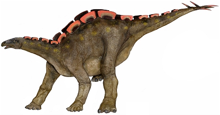 Строение телаДлина тела урхозавра достигала 7 метров. Высота же до 3 м. Весил он до 4 тонн.![]() Передвигался перимущественно на четырёх конечностях, хотя, возможно, кратковременно мог подниматься на две. Динозавр был приземистей и шире в бёдрах, чем оригинальный стегозавр. Об этом свидетельствует широкий таз и расширенный, укороченный конец подвздошной кости. Передние лапы – самые короткие из известных стегозавров. Из всего следует, что урхозавр особенно предпочитал низкорослую растительность. Остистые отростки позвонков у основания хвоста исключительно длинны. Хвост был снабжён четырьмя шипами, использующимися для самозащиты. Шея урхозавра достаточно длинна. Стройный ряд спинных пластин ящера, шедших в два ряда по всему телу, напоминает зубы фантастического создания. Это слегка закруглённые прямоугольники, при этом существенно ниже и шире чем у оригинального стегозавра. Второй вид Wuerhosaurus ordosensis был меньше и достигал 5 метров в длину, а весил до 1,2 тонн. Также имел широкий таз, но остистые отростки короче. Спинных позвонков у этого урхозавра насчитывалось 11 (что, скорее всего, применительно и к первому виду).