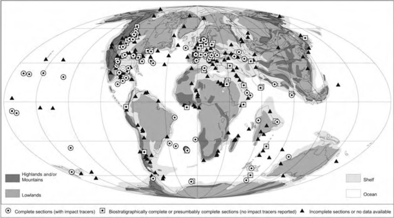 Иридиевая аномалияКаковы же свойства явления, затронувшего нашу планету на границе мела? Карты иридиевых аномалий будут весьма показательны. Предлагаем вашему вниманию иллюстрацию из научной работы Филлипа Клейса, Вольфганга Кисслинга и Уолтера Альвареса (2002 год).![]() Здесь: двойной белый круг – окрестности Чиксулуба; белые круги – аномалия присутствует, но концентрации неизвестны; остальные – области с иридиевой аномалией. Размер оных отражает концентрацию (1 ppb – это 0,0000001% материала). Всего это около 30% потенциальных зон, но уже здесь видно, что точки распределены по всей планете. Около 55% ещё находятся в процессе изучения. Это без учёта того, что периодически возникают новые. На текущий момент наибольшее число точек расположено на североамериканских и евразийских территориях. Это связано в первую очередь с тем, что основные палеонтологические и геологические исследования ведутся преимущественно в технически оснащённых странах с традиционно сильной научной базой. Или рядом с оными. Соответственно, в океанах работы проводятся совсем редко. Вторая причина – уровень доступности позднемаастрихтских слоёв. Очередной удар по астероидамЗамечено, что предполагаемое иноземное происхождение микрочастиц иридия является одним из доводов сторонников астероидной версии. На самом же деле существующая ныне база доказывает обратное. Точки различных концентраций разбросаны по всей карте, и не имеют прямой связи с предполагаемым эпицентром – Чиксулубом.Попытки же объяснить распространение аномалии невероятными морскими течениями, протаскивающих пылевые массы через всю Землю, или феноменальными воздушными потоками, наталкиваются на реальные факты: за много тысяч километров от Чиксулуба встречаются концентрации, сопоставимые с близлежащими. Одновременно с этим около 15% исследованных точек на М/П границе не содержат признаки аномалии вообще (всего в два раза меньше содержащих оные). Никакого равномерного распределения. Более того, некоторые из последних находятся в небольшом отдалении от тех, где признаки присутствуют. Судя по всему, имело место не полное покрытие планеты, а определённая зональность. У нас есть предположение, что она вполне может быть связана с ареалом обитания истребляемых НР видов. Свидетельств массового падения астероидов тоже не имеется: в частности нет никаких аналогичных Чиксулубу кратеров в хорошо изученной европейской зоне, где видятся немалые скопления. Так выглядит полная карта из этой же работы. ![]() Чёрные треугольники – места потенциальных аномалий, круги – места с зафиксированными признаками, квадраты – места без зафиксированных признаков. Очередной удар по вулканизмуКонцентрации иридия на М/П границе существенно превосходят среднестатистические. Хотя за историю планеты было предостаточно временных отрезков с активным вулканизмом, аналоги столь глобальной аномалии вне точек великих вымираний не зафиксированы. В частности, ни в промежутке юра-мел, ни за последующие после вымирания 66 миллионов лет. Это повторно опровергает теорию о катастрофическом вулканизме конца мезозоя.Таким образом, 66 миллионов лет назад некоторые зоны планеты были усыпаны микрочастицами, некоторые – свободны. Практически не остаётся сомнений, что сия картина связана с мел-палеогеновым вымиранием. Вопрос сост
