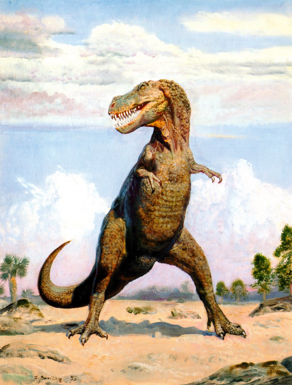 Время и место существованияСуществовали тарбозавры в конце мелового периода, около 71 – 69 миллионов лет назад (начало маастрихтского яруса). Были распространены на территории современной Монголии и Китая.![]() Реконструкция идущего динозавра, выполненная российским художником Андреем Атучиным. Виды и история обнаруженияНыне общепризнан единственный вид – Tarbosaurus bataar, соответственно являющийся типовым.Впервые тарбозавр был обнаружен в ходе советско-монгольской экспедиции в формацию Нэмэгт (аймак Умнеговь, Монголия) в 1946 году. Находка включала череп и несколько позвонков. Известный русский палеонтолог Евгений Малеев первоначально определил его как новый вид североамериканского тираннозавра – Tyrannosaurus bataar (1955 г.). Это совсем не удивительно, ведь общих признаков действительно предостаточно. Голотип получил идентификационный номер PIN 551-1. В том же году Малеев описывает ещё три черепа тарбозавра, каждый из которых дополнялся фрагментами скелета. Они были добыты в рамках той же экспедиции, но чуть позже, в 1948-49 годах. Причём все три особи были меньше первого по размеру. Экземпляр PIN 551-2 получил видовое название в честь знаменитого русского палеонтолога и писателя-фантаста Ивана Ефремова – Tyrannosaurus efremovi. А образцы PIN 553-1 и PIN 552-2 были отнесены к роду другого американского тираннозаврида горгозавра, получив имена Gorgosaurus lancinator и Gorgosaurus novojilovi. Однако в 1965 году другой русский палеонтолог Анатолий Рождественский заявляет, что все экземпляры, описанные Малеевым, принадлежат одному и тому же виду на различных стадиях роста. На этом основании он впервые сделал вывод о том, что теропод не является оригинальным тираннозавром. Рождественский присвоил новое роду название "тарбозавр", оставив при этом первоначальное имя вида без изменений – Tarbosaurus bataar. К тому времени их уже дополнили новые находки из пустыни Гоби. В начале статьи мы объяснили название тарбозавра, имя же вида bataar происходит от монгольского слова "герой". Оно не только отражает богатырское телосложение ящера, но и его нишу в позднемеловых степях. ![]() Известное воплощение тарбозавра в родной среде чешским художником Зденеком Бурианом. После этого большинство авторов, включая самого Малеева, признали корректность выводов Рождественского, хотя в некоторых публикациях называли единственный вид тарбозавра не Tarbosaurus bataar, а Tarbosaurus efremovi. Но точка в идентификации всё же не была поставлена. История продолжилась в 1992 году, когда американский палеонтолог Кеннет Карпентер повторно изучил собранный материал. Он заключил, что приведённых Рождественским отличий недостаточно для выделения рода, и поддержал первоначальные выводы Малеева. Как следствие, все имеющиеся образцы тарбозавров были им снова отнесены к Tyrannosaurus bataar. Исключение составил лишь бывший Gorgosaurus novojilovi, который Карпентер выделил в самостоятельный род малеевозавр (Maleevosaurus novojilovi). Но работа Карпентера не была поддержана широко. Более того, в 1999 году американский палеонтолог Томас Карр идентифицирует в малеевозавре юного тарбозавра. Таким образом, с 1999 большинство специалистов признают тарбозавра в качестве самостоятельного рода и упоминают Tarbosaurus bataar в новых описаниях или других публикациях. Теперь вернёмся к истории находок. Длительные советско-монгольские экспедиции сменились польско-монгольскими, стартовавшими в 1963 г. и з