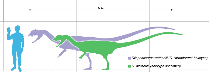 Время и место существованияСуществовали дилофозавры в начале юрского периода, около 199,3 – 190,8 миллионов лет назад (синемюрский ярус). Были распространены на территории Соединённых Штатов Америки, в Аризоне.![]() Итальянский художник Франко Темпеста показывает нападение пары голодных дилофозавров на раннего зауропода, предположительно саразавра (Sarahsaurus). Виды и история обнаруженияНыне общепризнан единственный вид – Dilophosaurus wetherilli, соответственно являющийся типовым.Ископаемые остатки голотипа дилофозавра впервые были обнаружены летом 1942 года в формации Кайента близ городка Таба Сити (штат Аризона, США). Открытие сделал американский палеонтолог Сэмюэл Уэллс. После извлечения образцы были доставлены в Калифорнийский Университет для очистки и сборки. Там Уэллс и составил научное описание в 1954 году. Важно отметить, что изначально динозавр был им причислен к роду мегалозавра (вид Megalosaurus wetherilli). Голотип дилофозавра, почти полный скелет, получил ярлык UCMP 37302. Набор всех имеющихся ныне образцов позволяет предположить, что он принадлежал полувзрослой особи. Второй экземпляр, на котором строилось описание, носит идентификатор UCMP 37303. ![]() Сытый дилофозавр отдыхает на живописном берегу. Автор: американская художница Хизер Кьот Лютерман. Вернувшись к раскопкам для определения возраста слоёв уже в 1964 году, Сэмюэл Уэллс удачно обнаруживает ещё один экземпляр, UCMP 77270, неподалёку от местонахождения первого. Эта находка позволила узнать гораздо узнать больше о динозавре, в частности впервые были обнаружены два необычных гребня на черепе. Поэтому в 1970 году он наконец был выделен Уэллсом в отдельный род – дилофозавр (вид Dilophosaurus wetherilli). В начале статьи мы объяснили родовое название дилофозавра. Видовое же имя wetherilli дано в честь канзасского исследователя Джона Уэтерила. В 1999 выходит работа Сэмюэла Уэллса и Пикеринга, в котором крупнейший экземпляр UCMP 77270 выделен в отдельный вид Dilophosaurus breedorum. Стоит отметить, что Уэллс, к сожалению, не успел завершить эту работу при жизни, и это пришлось сделать Пикерингу. Однако позднее, в 2005 году, американский палеонтолог Рональд Тикоски определяет в нём взрослую особь типового вида Dilophosaurus wetherilli. ![]() Скульптура дилофозавра, демонстрируемая в Парке Динозавров (г. Роки Хилл, штат Коннектикут, США). В 2001 году американский палеонтолог Роберт Гэй сообщает об обнаружении в хранилище Музея Северной Аризоны двух или трёх новых экземпляров дилофозавра (объединены ярлыком MNA P1). Они были обнаружены ещё в 1978 году в той же формации Кайента. Гэй отмечает что они имеют ряд общих черт с голотипом UCMP 37302, но при этом содержат элементы таза, ранее не представленные. Китайский вид Dilophosaurus sinensis, описанный в 1993, ныне полностью выделен в отдельный род – синозавр (Sinosaurus). Строение телаДлина тела дилофозавра достигала 7 метров. Высота же до 2 метров. Весил он до 400 килограммов. Является одним из самых крупных хищных динозавров начала юрского периода.![]() Сравнение голотипа и крупнейшего экземпляра этого теропода с человеком. Автор — Мэттью Мартынюк (Соединённые Штаты). Передвигался аризонский динозавр на двух длинных трёхпалых ногах. Бедренная кость длиннее (до 590 мм), чем большеберцовая (до 558 мм). Ноги и общее строение тела дилофозавра показывает, что дилофозавр был очень быстрым динозавром. Скорость была особенно важна при охоте за небол